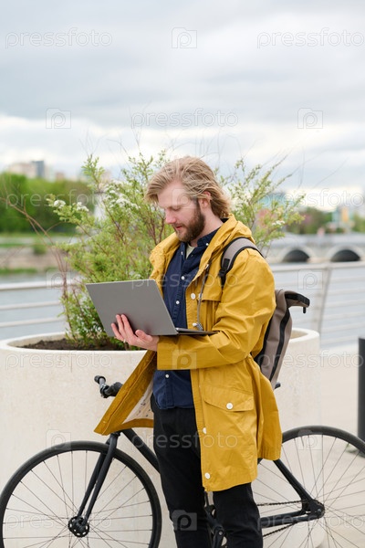 Бизнесмен с ноутбуком, использующий велосипед для езды