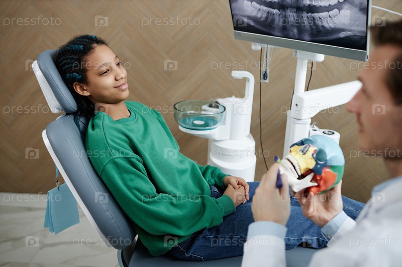 Чернокожая девочка-подросток в стоматологической клинике сидит на стуле и слушает зубного врача