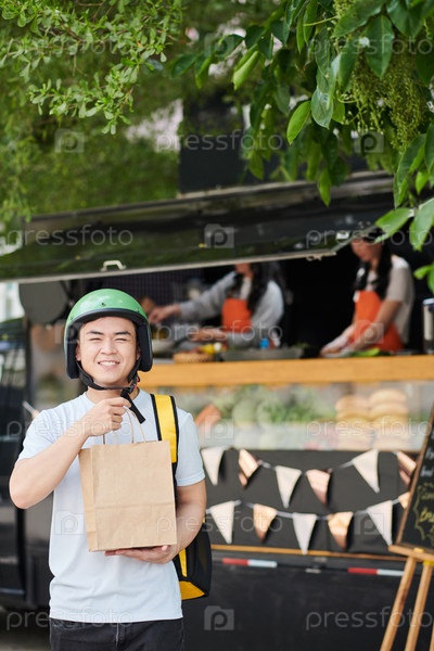 Счастливый молодой доставщик в защитном шлеме, держащий бумажный пакет