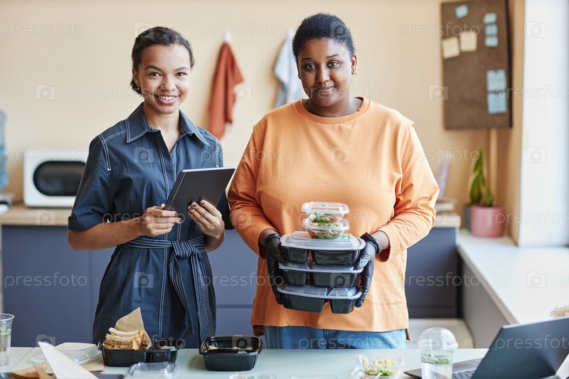Две улыбающиеся молодые женщины, работающие в сфере доставки еды и упаковки заказов
