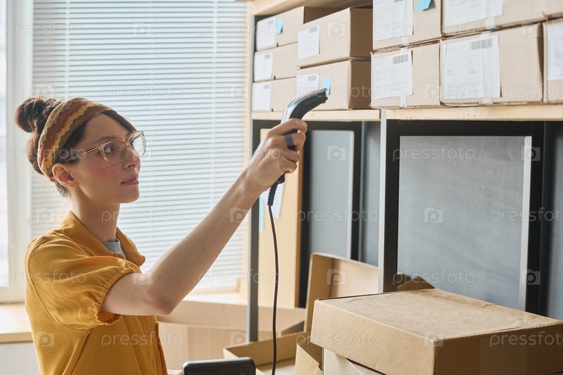 Женщина сканирует квитанции на посылках