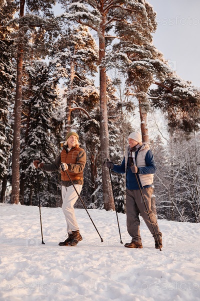 Спортивная старшая пара гуляет в зимнем лесу