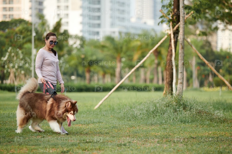 Женщина, играющая с собакой-самоедом