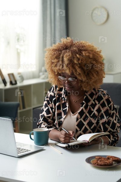 Женщина делает заметки во время видеозвонка на ноутбуке