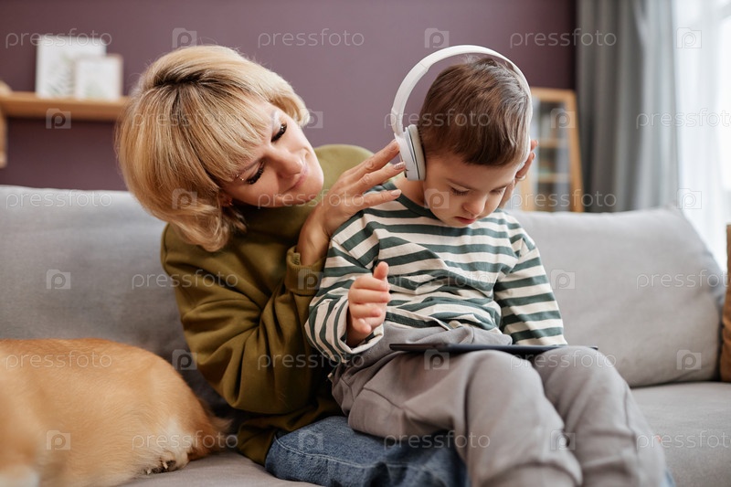 Любящая мать ставит наушники на маленького мальчика с синдромом Дауна, используя ноутбук