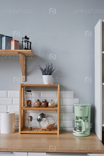 Кухонный дизайн деревянная полка с пряностями травы на кухонном столе