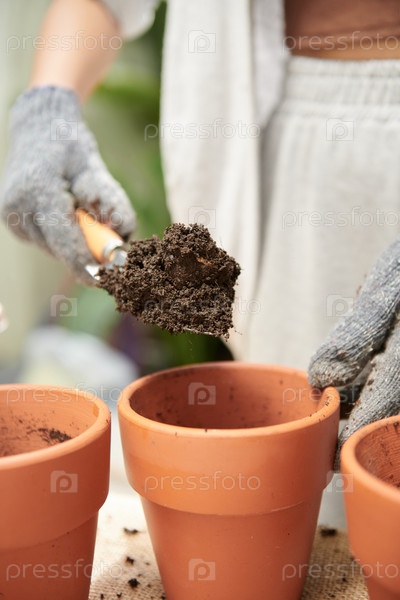 Наполнение цветочных горшков почвой