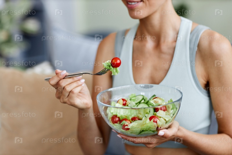 Ближайшее изображение женщины, едящей свежий салат