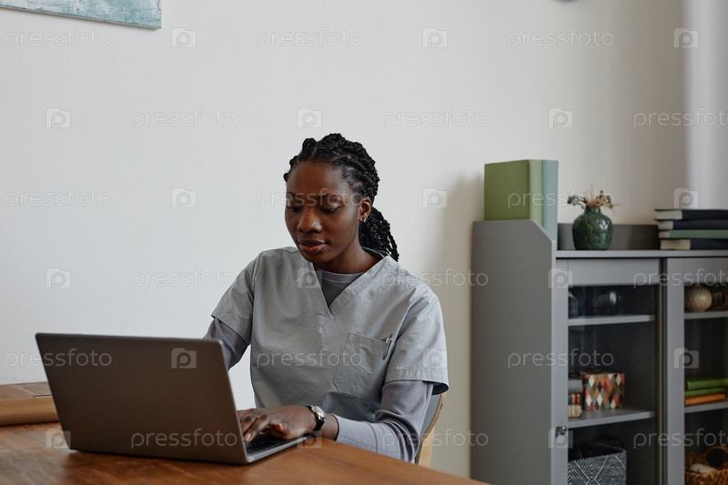 Молодая медсестра использует ноутбук за столом