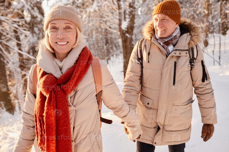 Улыбающаяся пожилая пара ходит зимой