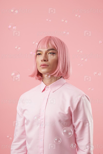 Человек, стоящий под падающими мыльными пузырями
