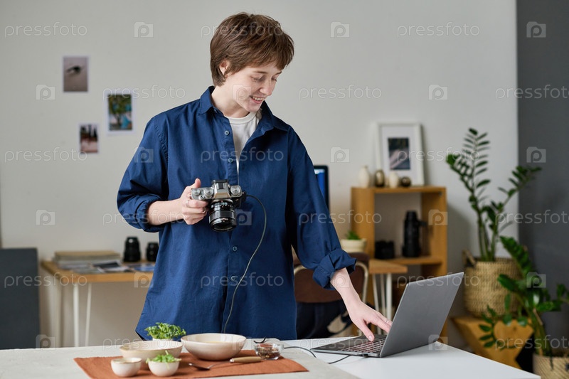 Фотограф использует ноутбук на работе