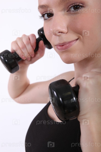 Девушка тренируется с гантелями