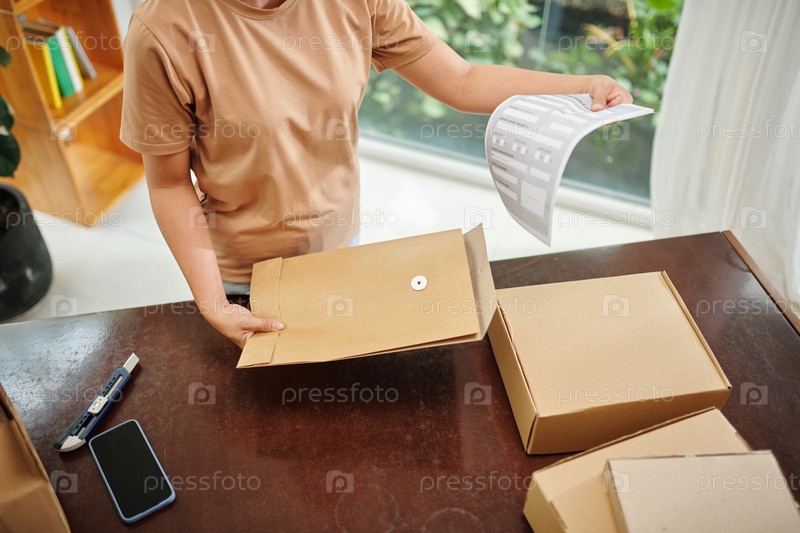 Женщина кладет документ в бумажный конверт