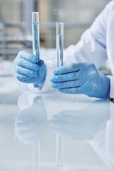 Перчатки рук молодой женщины-вирусолога, держащей две бутылки с жидкостями