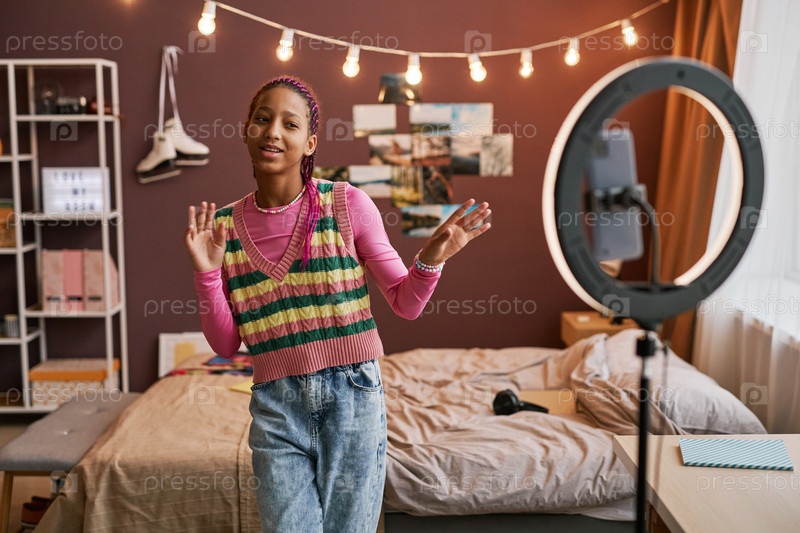 Черная девочка-подросток записывает танцевальное видео для социальных сетей, поет