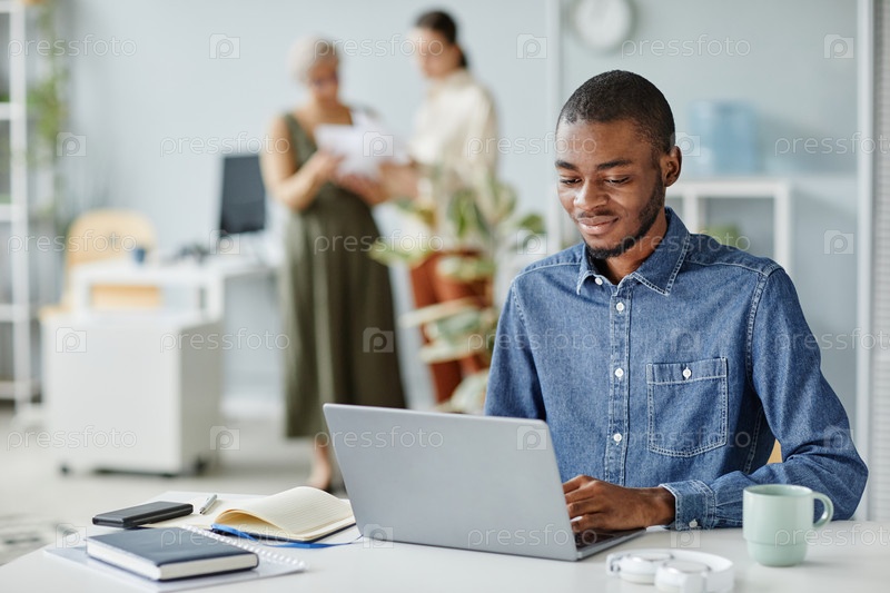 Молодой чернокожий мужчина использует ноутбук на рабочем месте минимально
