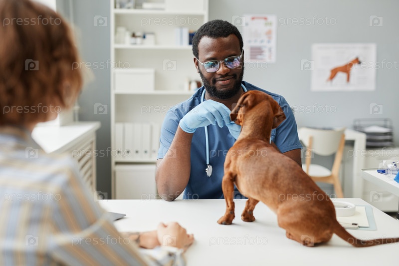 Молодой врач современных ветеринарных клиник осматривает больного пса