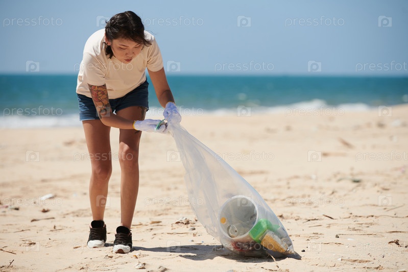 Женщина, собирающая мусор на пляже