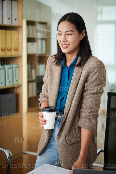 Молодая бизнесвуменка пьет кофе в офисе