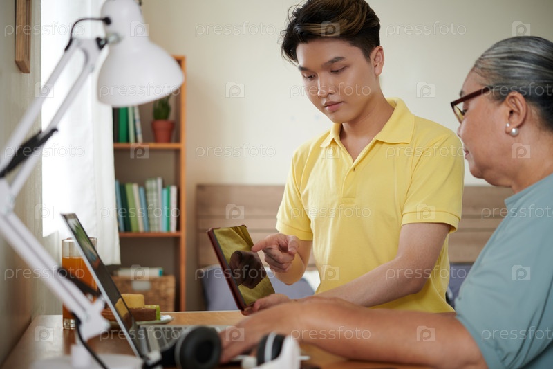 Мальчик-подросток показывает бабушке планшет