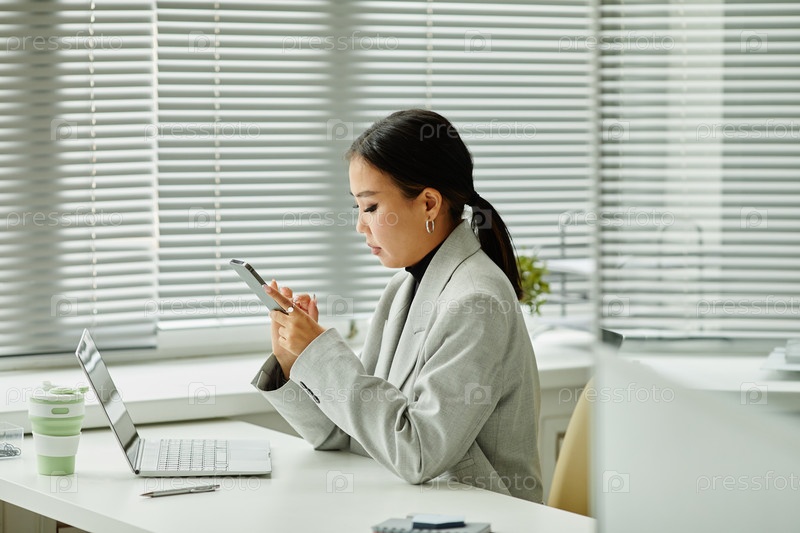 Азиатская женщина, использующая смартфон на рабочем месте