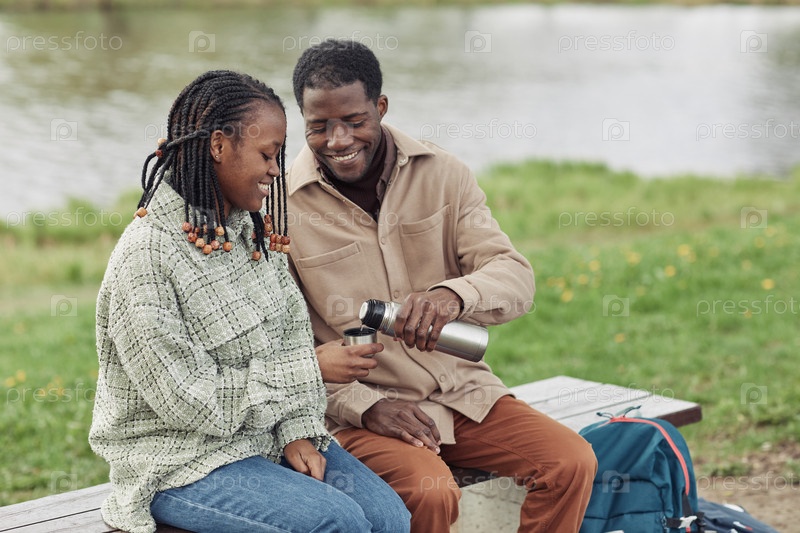 Молодая африканская пара пьет чай на свежем воздухе