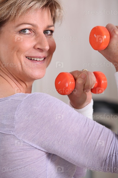 Зрелая женщина занимается с гантелями