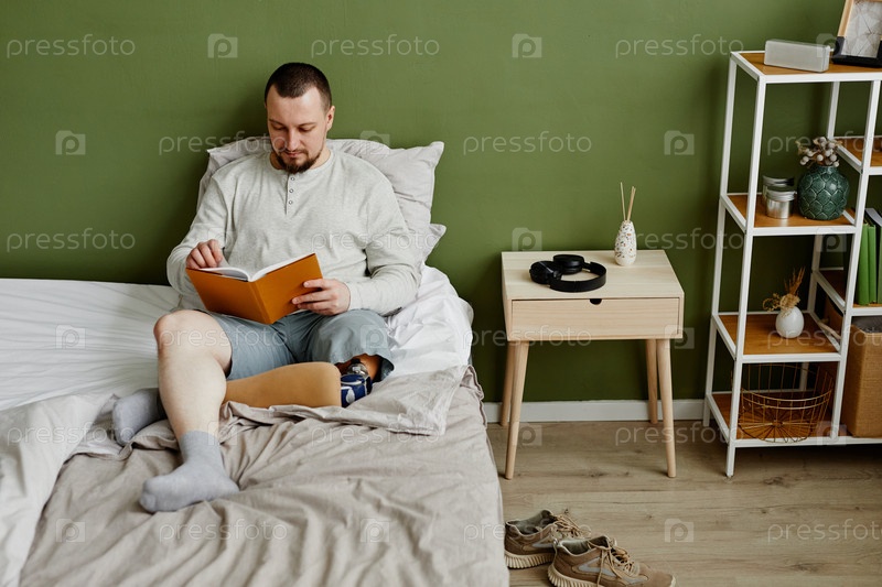 Молодой человек с протезированной ногой читает книгу