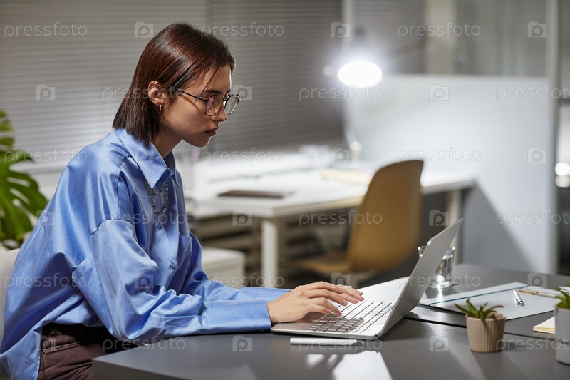 Молодая женщина работает допоздна в офисе