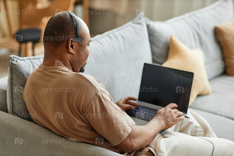 Чернокожий мужчина использует ноутбук с гарнитурой во время работы на онлайн-встрече