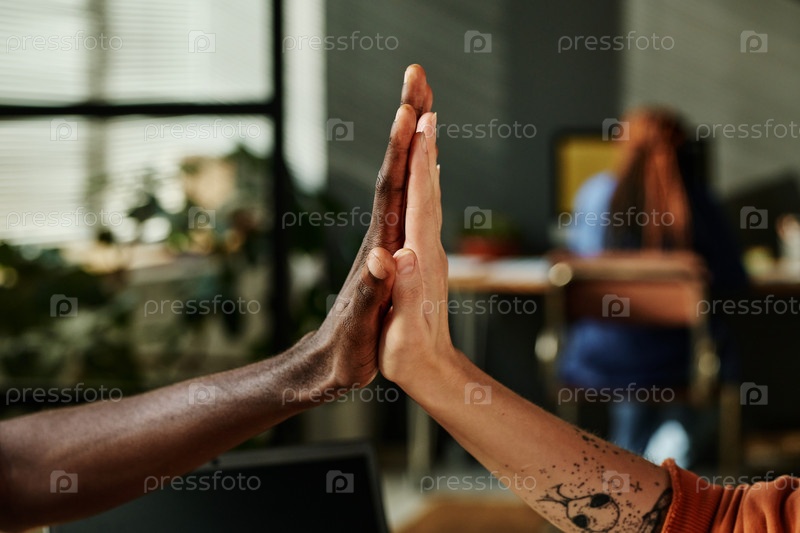 Руки двух молодых межкультурных офисных работников во время пятидесятницы