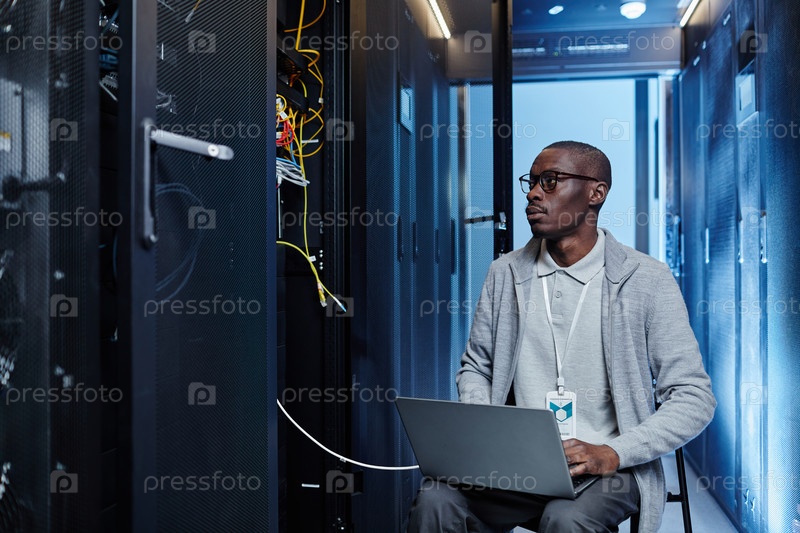 Черный человек настраивает сервер в центре обработки данных