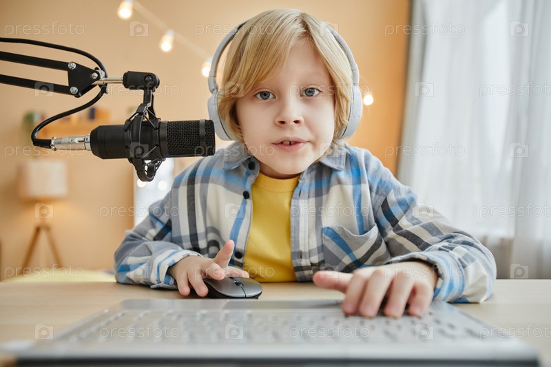 Милый школьник, нажимающий мышью и кнопки клавиатуры ноутбука
