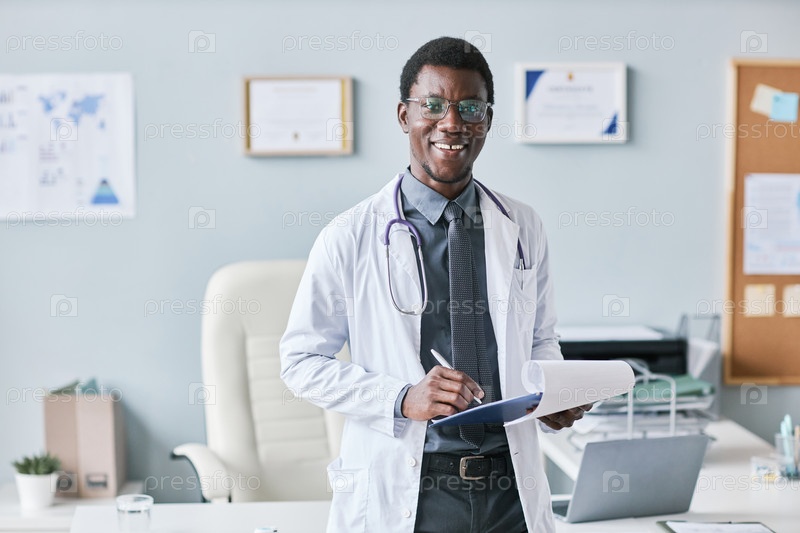 Молодой афроамериканский врач, держащий в руках клипборд и улыбающийся на камеру