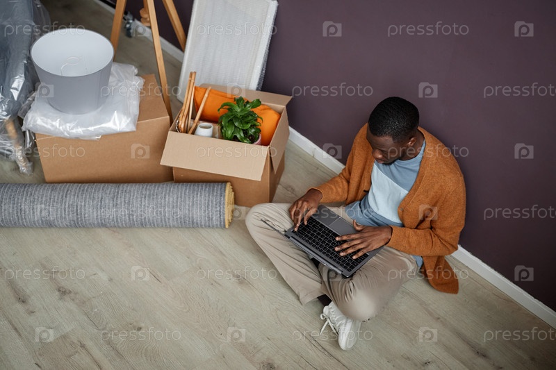 Молодой человек использует ноутбук дома