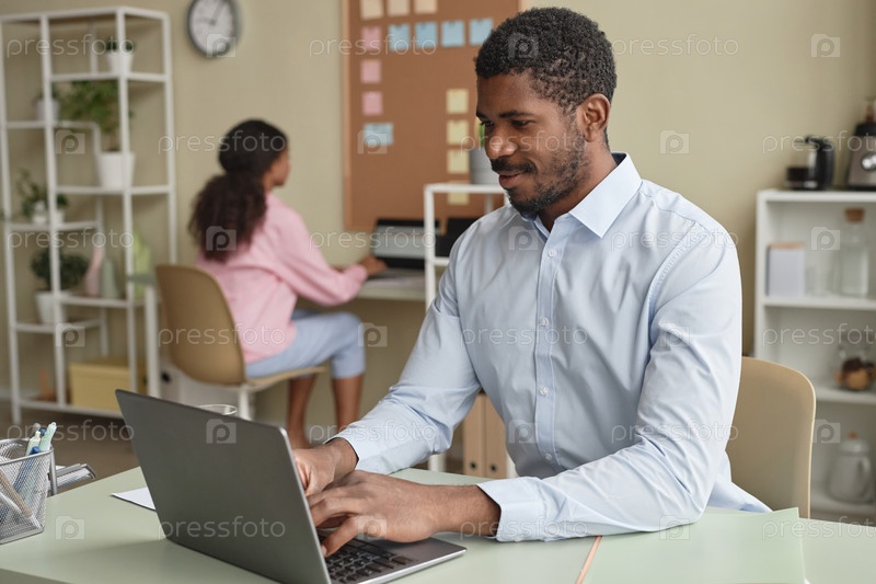 Улыбающийся чернокожий профессионал работает с ноутбуком за столом
