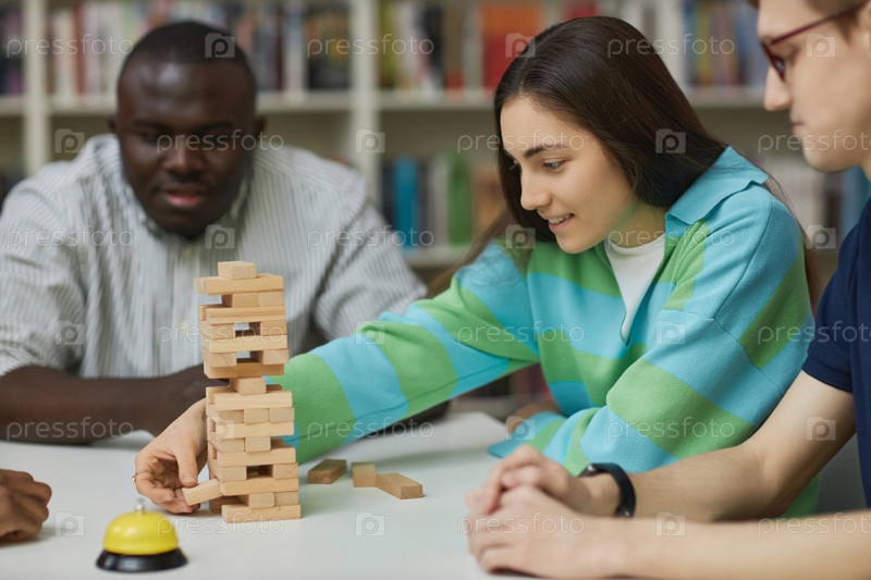 Улыбающаяся молодая женщина играет в игру с балансовой башней со своими друзьями в библиотеке