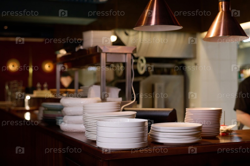 Несколько стеков белых тарелок, стоящих на стойке или рабочем месте шеф-повара