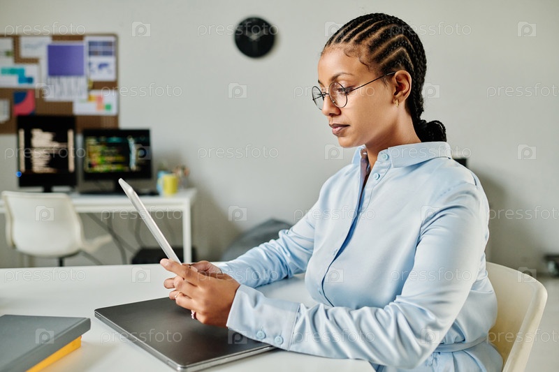 Женщина, работающая на планшетном компьютере в офисе