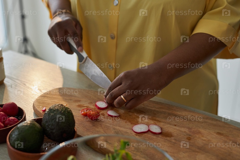 Женщина режет овощи для салата