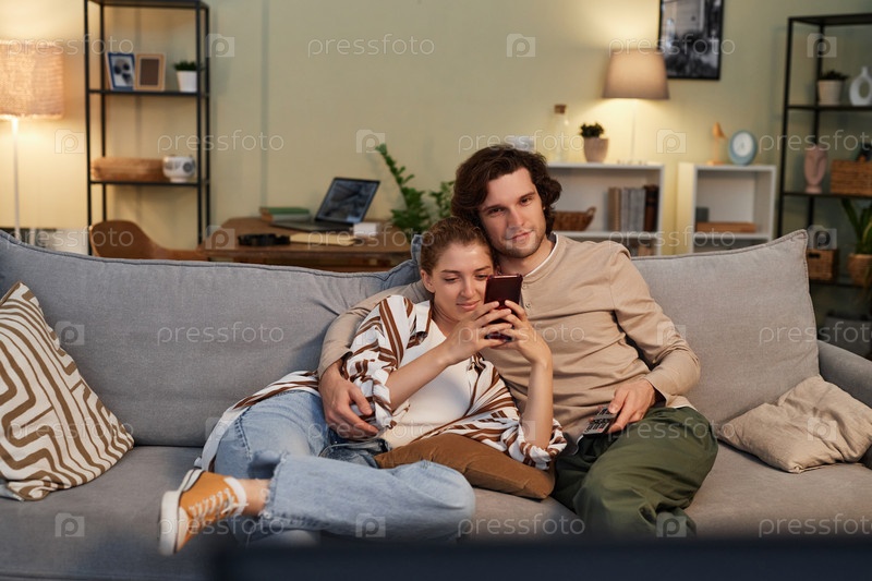Пара смотрит телевизор дома вместе, сидя на удобном диване и обнимаясь