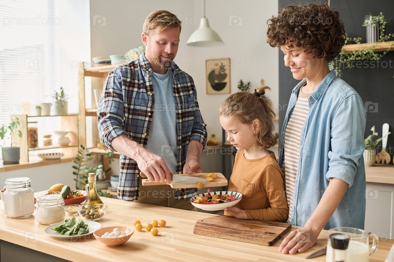 Семья готовит салат вместе на кухне