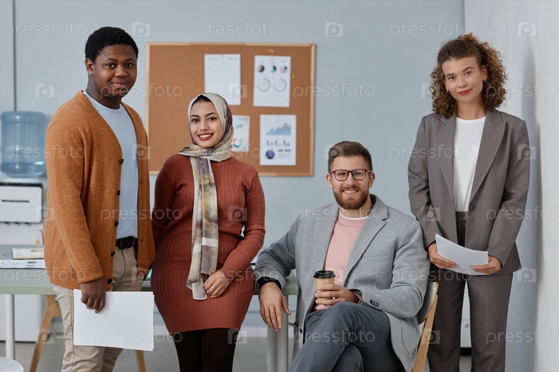 Группа молодых успешных сотрудников с документами, стоящими на посту