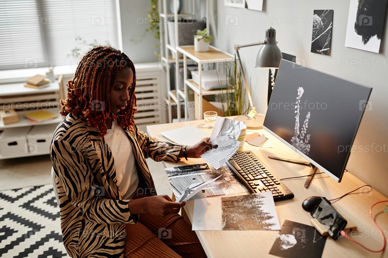 Чёрная женщина-фотограф на рабочем месте