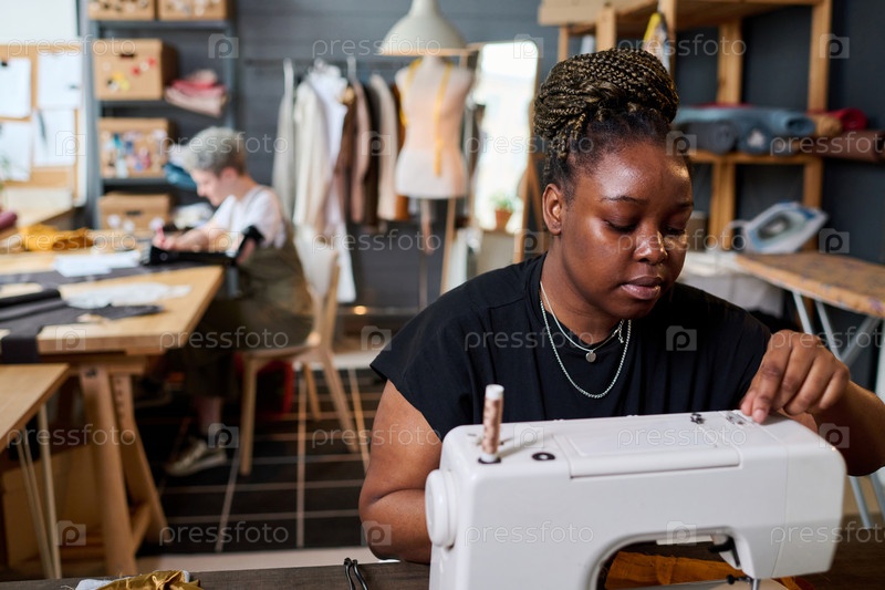 Молодая афроамериканская швея, сидящая перед электрической швейной машиной