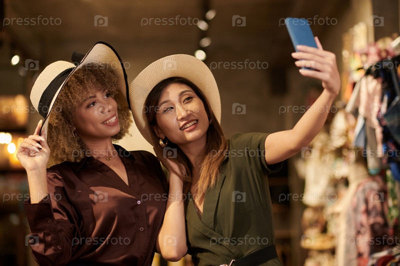 Друзья делают селфи во время покупок
