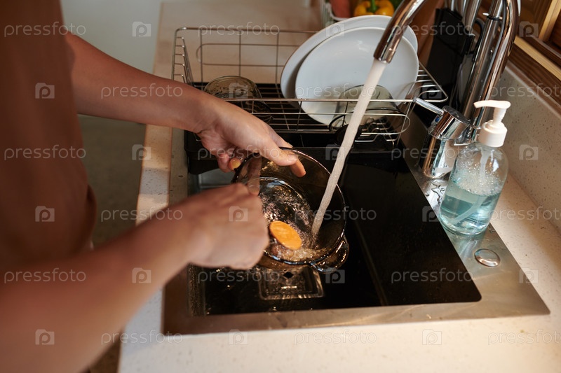 Человек моет кастрюлю в раковине