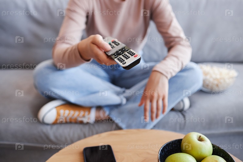 Женщина сидит на диване с перекрещенными ногами и держит пульт дистанционного управления