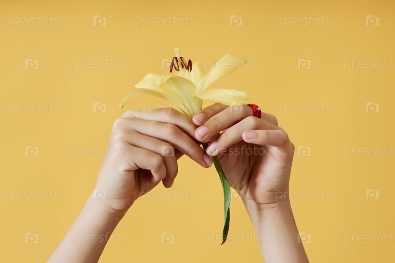 Минимальная девочка-подросток, держащая цветок лилии на желтом